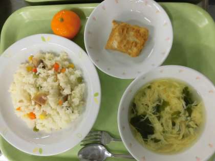 三色ピラフ 牛乳 鶏肉のカレー焼き 卵と野菜のスープ くだもの