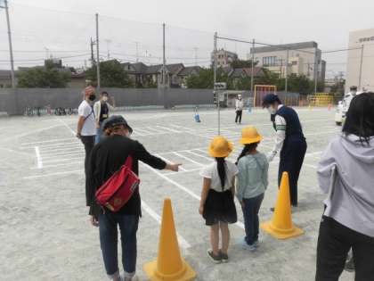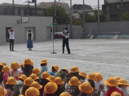 1年生が2校時に北沢警察の方に来ていただき、横断歩道のわたり方や、道路の正しい歩きなど教えていただき、実際に校庭に信号機を設置して実際に歩いたりしました。二人一組で注意を守って歩くことができました。登下校や、遊びに行くときもしっかりと交通安全を意識して歩きましょう。保護者の方もお手伝いいただきありがとうございました。