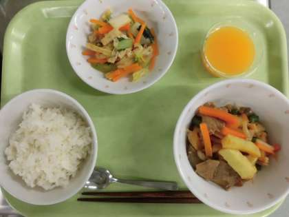 今日のごはんには、大麦が入っています。大麦には、白米には少ない、微量なミネラルと言われる栄養が多く含まれています。また、食物繊維と言って、みなさんのお腹の調子をよくしてくれる成分も入っています。大麦は少ししか含まれていないので分かりにくいですが、お米とは違った食感を楽しむことが出来ます。