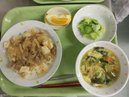 豚丼 牛乳 ひとしお野菜 かきたま汁 くだもの