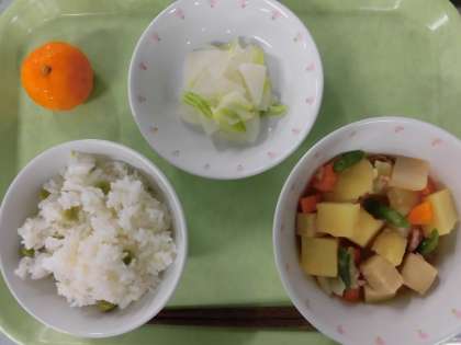 グリーンピースごはん 牛乳 肉じゃが 野菜の甘酢かけ くだもの