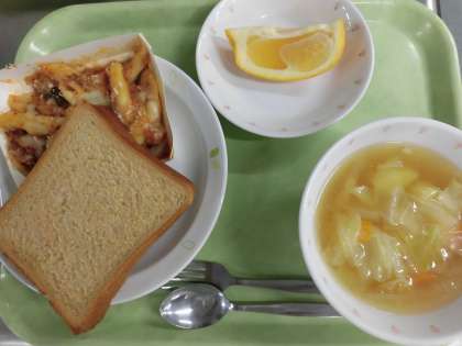 黒砂糖パン 牛乳 なすのグラタン キャベツスープ くだもの