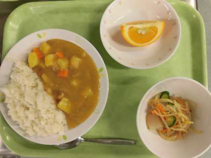 チキンカレー 牛乳 こんにゃくサラダ くだもの