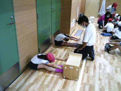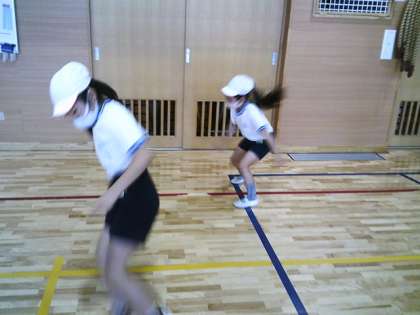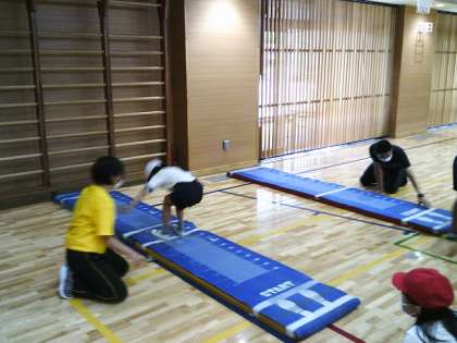体育館で体力テストを全学年で実施しました。1年生は6年生と、2年生は5年生と一緒に行いました。種目は、長座体前屈と立ち幅跳び、反復横跳び、上体起こしの4種目を行いました。2年生以上の人は去年よりどのくらい記録が伸びたでしょうか?
