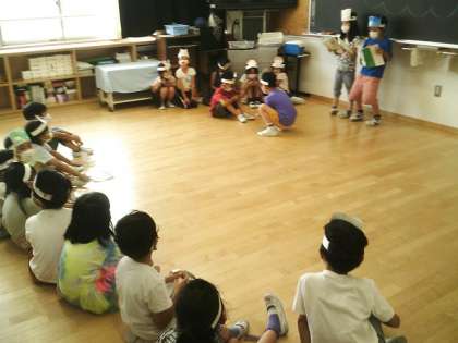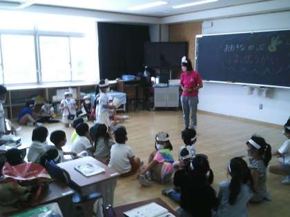1年1組で、国語で学習している「おおきなかぶ」の音読発表をしていました。音読にあわせて動いています。役になり切って頑張って発表していました。