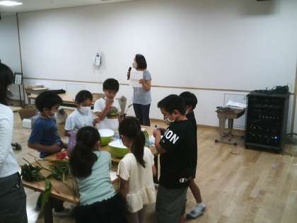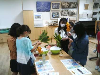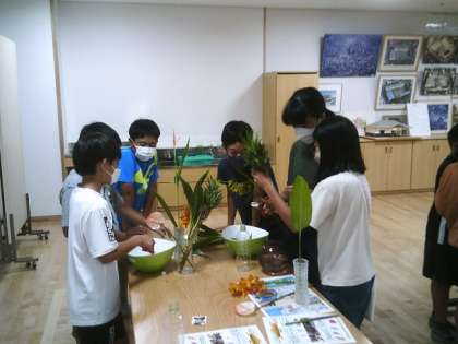 ワンコインクラブの方にきていただき7月の「花を生ける日」の活動を多目的室で行いました。今日は、夏らしい南国の草花をもってきてくださいました。「パイナップル スタール—ジュ」は、鑑賞用のパイナップルで、触ってもいたくないようにとげが少なめです。普段あまり目にすることのないお花でしたが、とても花の色が鮮やかでした。教室に飾って夏を感じましょう。今日もご指導ありがとうございました。