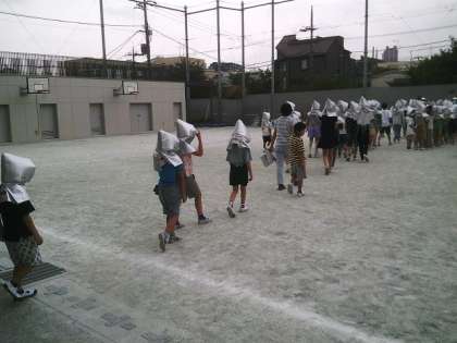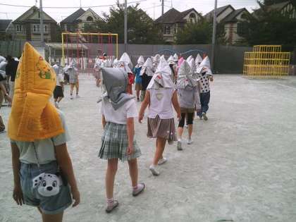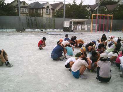 7月の避難訓練を行いました。中休み中に地震が起こったことを想定した訓練でした。校庭で遊んでいた子どもたちは、放送を聞いて校庭の中央にすぐに集まりました。授業中以外に火事が起こった時の避難の仕方を学びました。