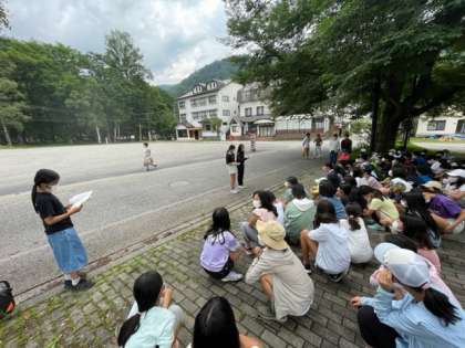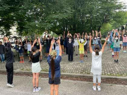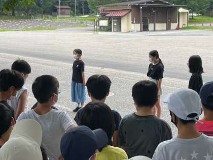 朝会をしています。少し眠そうにしている人もいます。宿舎での生活も後少しです。最後まで気持ちよく過ごしましょう。