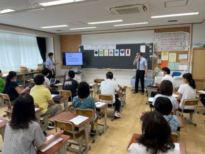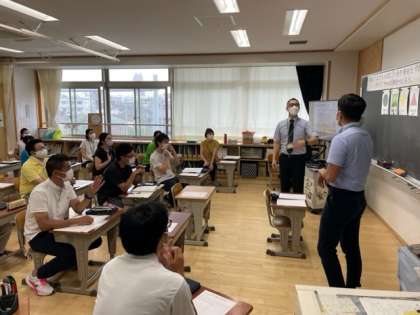 講師の先生を招いて外国語の授業についての研修会を行いました。模擬授業を子どもになって受けたりしながら、指導についてたくさんのことを学びました。