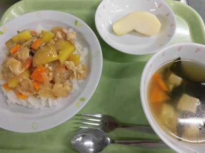 タッカルビ丼 牛乳 わかめスープ くだもの