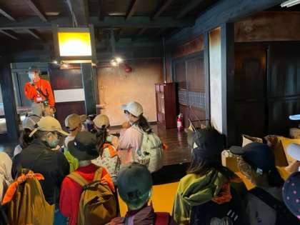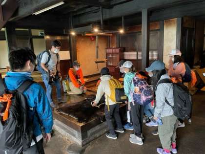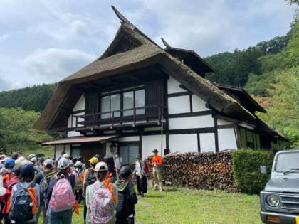 茅葺き屋根の立派な古民家を見学しています。茅葺き屋根を葺き替えるには5000万もかかるそうです。なぜ、そんなにかかるのかも説明してくれました。古民家の中の様子も見ることができました。