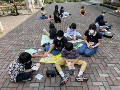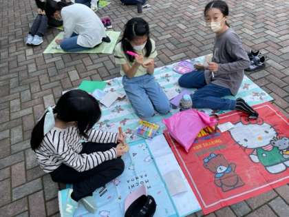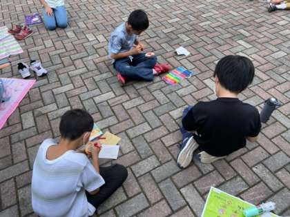 1組のコースター作りの様子です。ツルツルになるよう紙やすりの使い方をアドバイスしながら楽しく取り組んでいます。絵も色々考えながら色を塗っています。