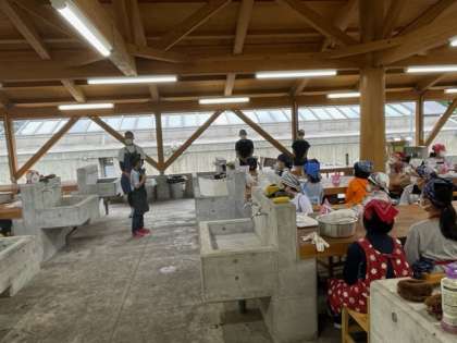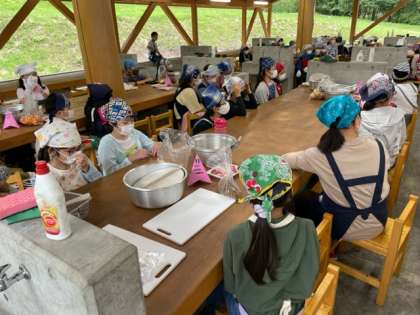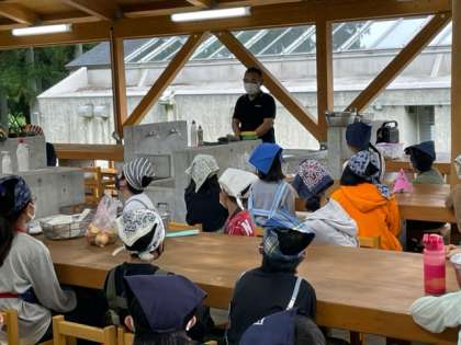 夕食で食べるカレー作りが始まります。まず、補助員の井上先生から作る際の注意などを聞いています。しっかりと聞いて協力して美味しいカレーを作りましょう。