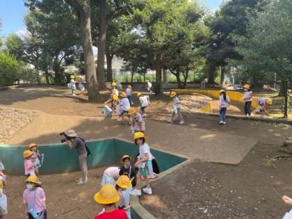 遊びが終わった後は、「どんぐりひろい」です。遊んでいるときのもどんぐりが落ちている場所を見つけていた子どもたちは、一目散に拾いに行っています。たくさんのどんぐりが拾えました。