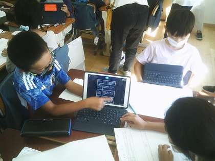 先週、雨の中、スーパーマーケット見学に行った3年生。今日は3年3組が校内研究授業を5時間目にしました。「信濃屋さんにたくさんのお客さんがくるのか」、見学したことをもとに自分の考えを友達と交流しながらグループでワークシートに図でまとめる授業をしました。タブレットも使ってみんなで協力して取り組みました。協議会では子どもたちの意欲的な様子をほめていただくとともに、授業の改善点等についてもたくさんの意見をいただきました。