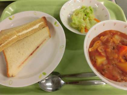 二色サンド 牛乳 ポークシチュー 野菜サラダ