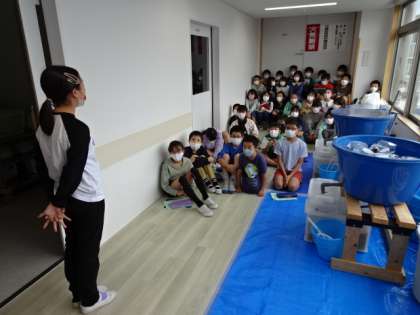 今年度も5年生がヒラメの養殖に挑戦します。今日は、4校時に2組、5校時に1組がヒラメの受け入れ式をしました。とっても小さなヒラメを大事そうに水槽に入れました。これから自分たちで」お世話をしていきます。小さな命を大切に育てていきましょう。