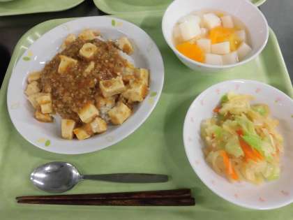 麻婆豆腐丼 牛乳 中華サラダ 杏仁豆腐