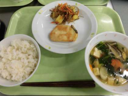こめ(秋田) おおむぎ(国内) とりにく(岩手) 沖さわら(神奈川 静岡) とうふ(だいず 佐賀) だいず(宮城) あぶらあげ(だいず 宮城) しょうが(高知) にんじん(北海道) ごぼう(青森) じゃがいも(北海道) ねぎ(青森) 小松菜(東京) こんぶ(北海道) しいたけ(九州)