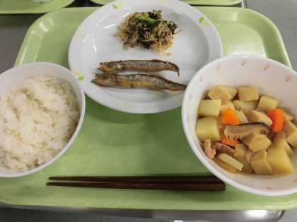 麦ごはん 牛乳 シパイシーししゃも こまつなの乾物和え 肉じゃが