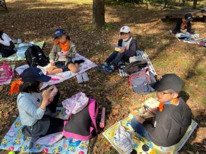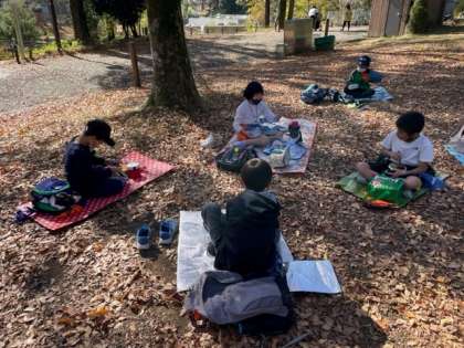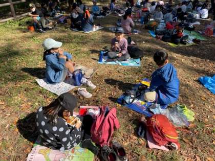 1時間半以上歩き回ってお腹もペコペコです。ワシタカ広場でみんなでお弁当です。みんなで食べる初めてのお弁当は格別です。笑顔がたくさん見られました。
