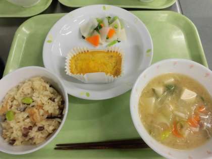 まめまめごはん 牛乳 千草焼き 野菜の甘酢かけ 粕汁