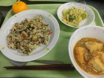 磯おこわ 牛乳 生揚げのそぼろあん ごま酢かけ くだもの
