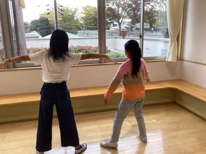 窓に映る自分たちのダンスを見たり、お手本の動画を見たりしながら取り組んでいました。