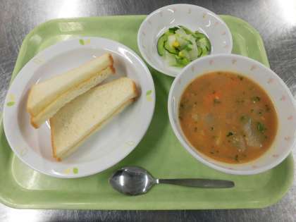 パン(小麦 国内) ぶたにく(茨城) たまねぎ(北海道) ベーコン(ぶたにく 埼玉) じゃがいも(北海道) ピーマン(茨城) にんじん(北海道) パセリ(千葉) はくさい(茨城) とうもろこし(北海道) きゅうり(埼玉)
