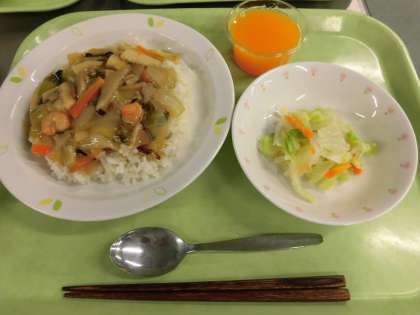 こめ(秋田) ぶたにく(茨城) いか(青森) えび(インド) にんにく(青森) しょうが(高知) にんじん(北海道) はくさい(茨城) チンゲンツァイ(茨城) きゃべつ(神奈川) だいこん(千葉) たまねぎ(北海道) しいたけ(九州) たけのこ(九州) みかんジュース(みかん 九州)