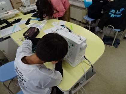 6年1組の子どもたちが家庭科でクッションを作っています。布にさしこで模様を縫い、ミシンで袋状に縫って、ファスナーもミシンで縫って完成です。さしこもミシンの慎重に取り組んでいます。