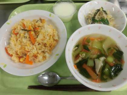 今日は、みなさんの大好きなキムチチャーハンです。チャーハンの辛みは、キムチのつけ汁で調整しています。少し辛いけれど、1年生でも食べられる辛さを目指して味付けしています。ホワイトゼリーも給食室の手作りです。