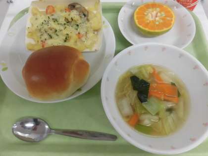 バターロールパン 牛乳 マカロニグラタン 野菜のスープ くだもの