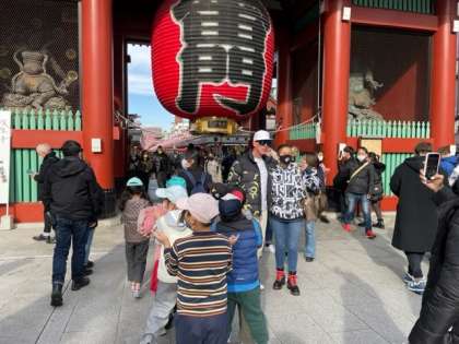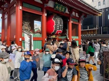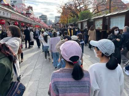 仲見世を雷門に向かってクラスごとで見学し、雷門で写真を撮ってUターンして仲見世を本堂に向って戻ってきました。たくさんのお店に興味津々ですが、買い物は家の人と来た時のお楽しみに取っておきました。外国人の観光客もたくさんいました。