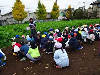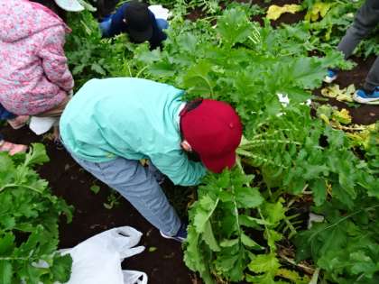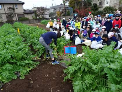 今回抜く大根は「おふくろ大根」です。係の方のお話を聞いて、先生の抜き方の手本を見てから挑戦です。抱えるぐらい大きな大根です。