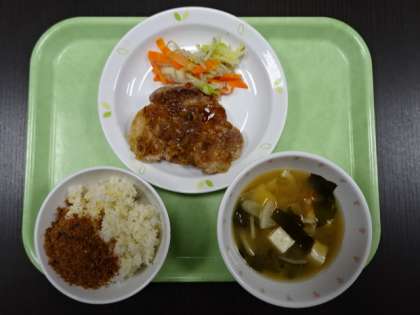 あわごはん ふりかけ 豚肉の南蛮ソース 野菜炒め 味噌汁