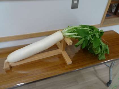 今日のおでんは、せたがやそだちの大蔵大根が入っています。大蔵大根は、江戸時代に源内という農民が作り出した品種で、円筒形の先端が丸く詰まっているのが特徴です。よく見かける青首大根と青首大根とは違いがあります。大根の重さは、3キログラムくらいあります。生まれたばかりの人間の赤ちゃんと同じくらいの重さです。