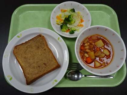 食パン(小麦粉 北海道) いんげん豆(北海道) じゃがいも(北海道) たまねぎ(北海道) にんじん(千葉) ブロッコリー(東京) とうもろこし(北海道) ぶたにく(茨城) たまご(青森)