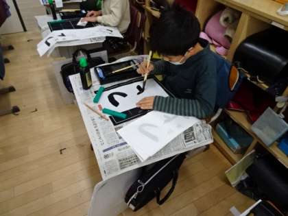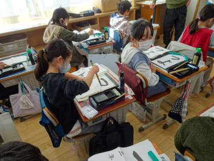 毛筆が始まった3年生。書き初めも毛筆で取り組みます。土曜授業の今日は、3学級とも書き初め練習でした。小筆で自分の名前の練習をしたり、「つよい力」の文字の書き方のポイントを教わったりしながら、真剣に取り組んでいました。習字の準備や片付けもとても上手になっています。