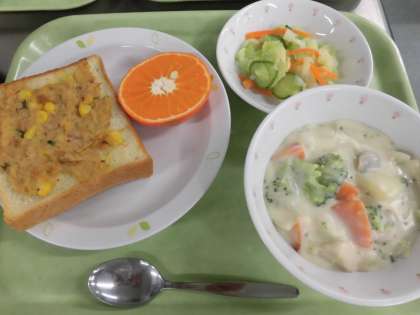 ツナコーントースト 牛乳 クリームシチュー フレンチサラダ くだもの