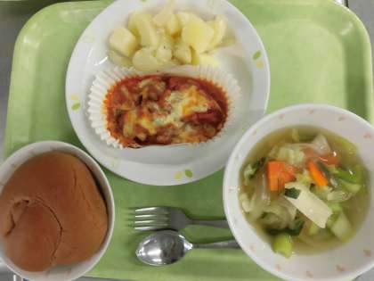 ココアパン 牛乳 魚のピザ風 ジャーマンポテト キャベツのスープ