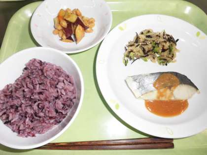 黒米ごはん 牛乳 魚のピリ辛ソース 野菜のおかかあえ お豆かりんとう