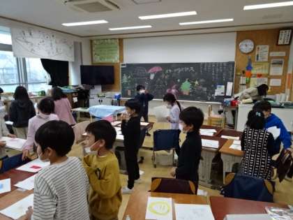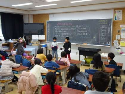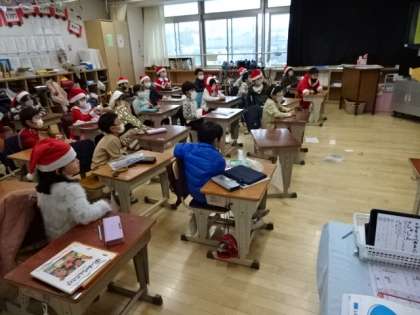 2学期末を迎え「お楽しみ会」を開いている学級がたくさんあります。1年生のクラスには、かわいらしいサンタさんがたくさんいるクラスもありました。みんな友達の出し物に拍手をしたり、みんなでゲームを楽しんだりしました。