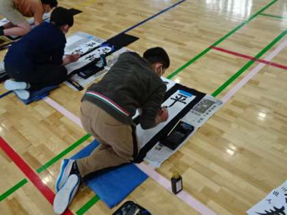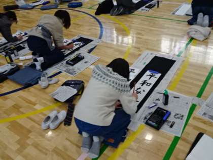 6年生が体育館で書き初め会を行いました。小学校最後の書き初めは「平和な春」です。一文字一文字思いを込めて書いている姿が素晴らしいです。