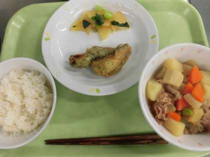 麦ごはん 牛乳 肉じゃが 魚の磯辺揚げ 大根のレモンしょうゆ