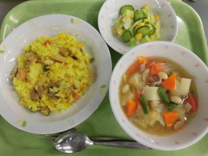 パエリア 牛乳 田舎風スープ フレンチサラダ