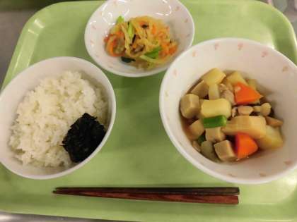 海苔の佃煮は給食室での手作りです。海苔を水でふやかして甘辛い味付けで煮詰めていきます。市販品を使いがちな、ふりかけも給食室で手作りしています。調理員さんの温かな心のこもった給食を残さずいただきましょう。