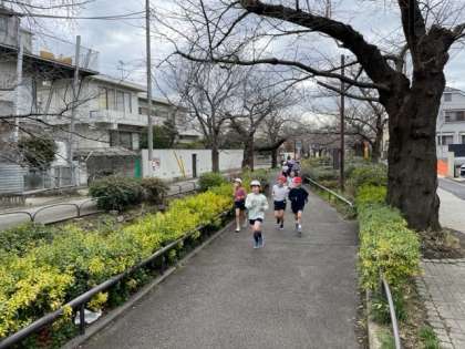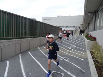 3年生からは、せせらぎ緑道を走ります。寒い中ですが、PTAの皆さんが車や自転車を止めていただき安全に実施することができました。