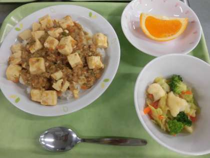 麻婆豆腐丼 牛乳 カリフラワーの中華あえ くだもの