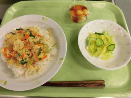 献立は、本の中で出てくるようなカレーライスではありませんが、給食室でどのようなことをしているのかがよくわかるおはなしです。代沢小学校の給食室の調理員さんたちは、朝6時40分くらいから出勤していて、その日に使う食材を配達の人から受け取っています。朝早くから、たくさんの人たちが働いていて、給食は多くの人たちに支えられ、みなさんの教室へと届けられています。